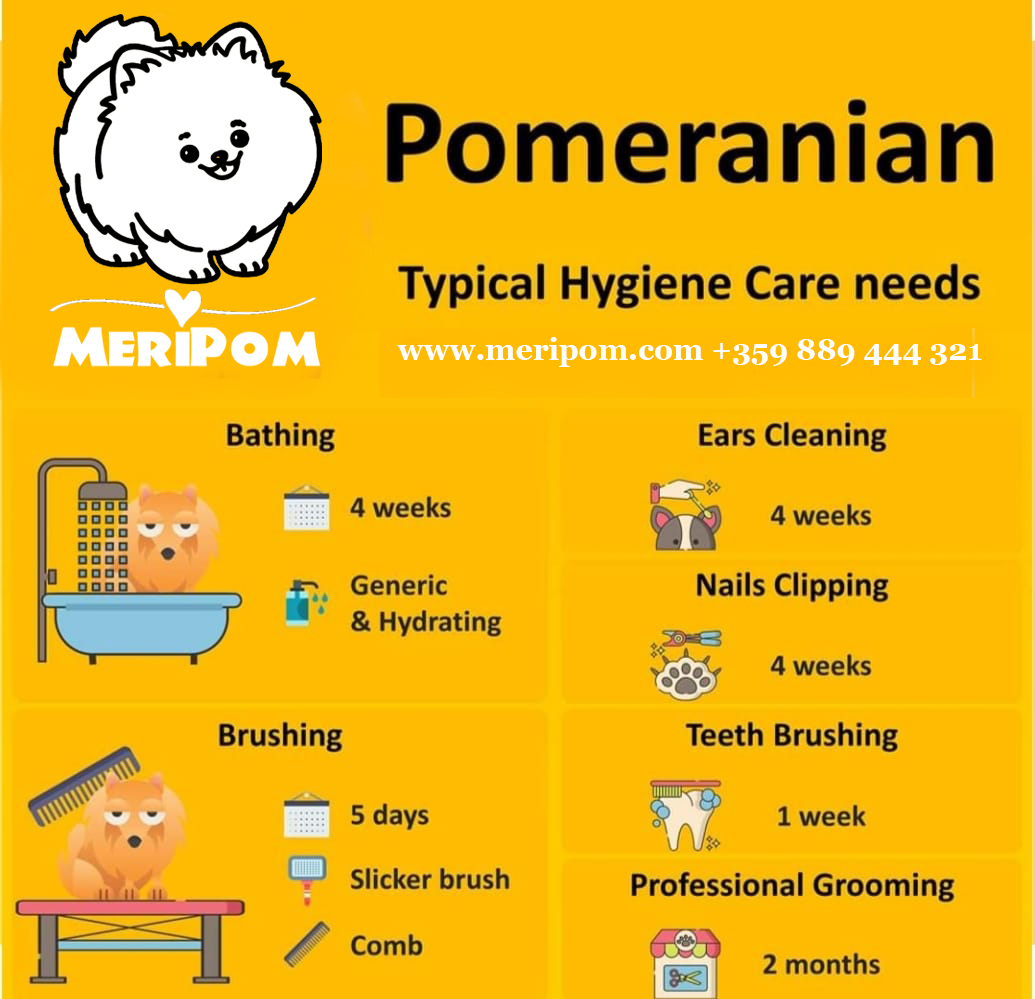 Типични хигиенни грижи за Померан и техният интервал В MeriPom препоръчваме Къпане Веднъж на 4 седмициосновно и хидратиращо Почистване на уши Веднъж на 4 седмици Рязане на нокти Веднъж на 4 седмици Ресане На всеки 5 денапърво с гре